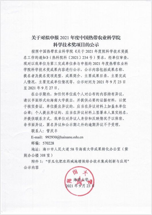 上一篇:关于2021年度中国热带农业科学院科学技术奖提名项目的公示