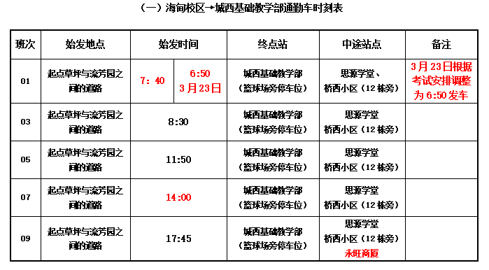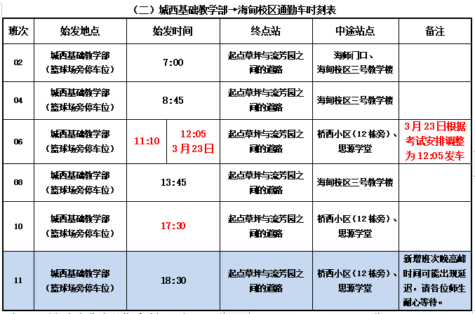 2022-2023学年第一学期期末考试海甸校区与城西基础教学部通勤车运行时刻表(2023年3月16日-17日,20-24日)