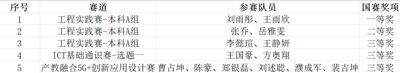 本次大赛中,我校学子不负众望,除获全国一等奖1项外,还斩获国奖5项、省奖49项。国赛层面:工程实践赛道获 1 项二等奖、1 项三等奖,ICT 基础通识赛道与产教融合 5G + 创新应用设计赛道各获 1 项三等奖;省赛层面:11 组获一等奖、15 组获二等奖、23 组获三等奖,获奖率达 52%,更实现历史性突破,充分展现了我校学子在信息通信领域的综合实力。