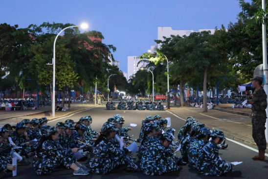 夜幕降临,同学们齐聚操场,在教官的带领下,校园里回荡起激昂的军歌声。