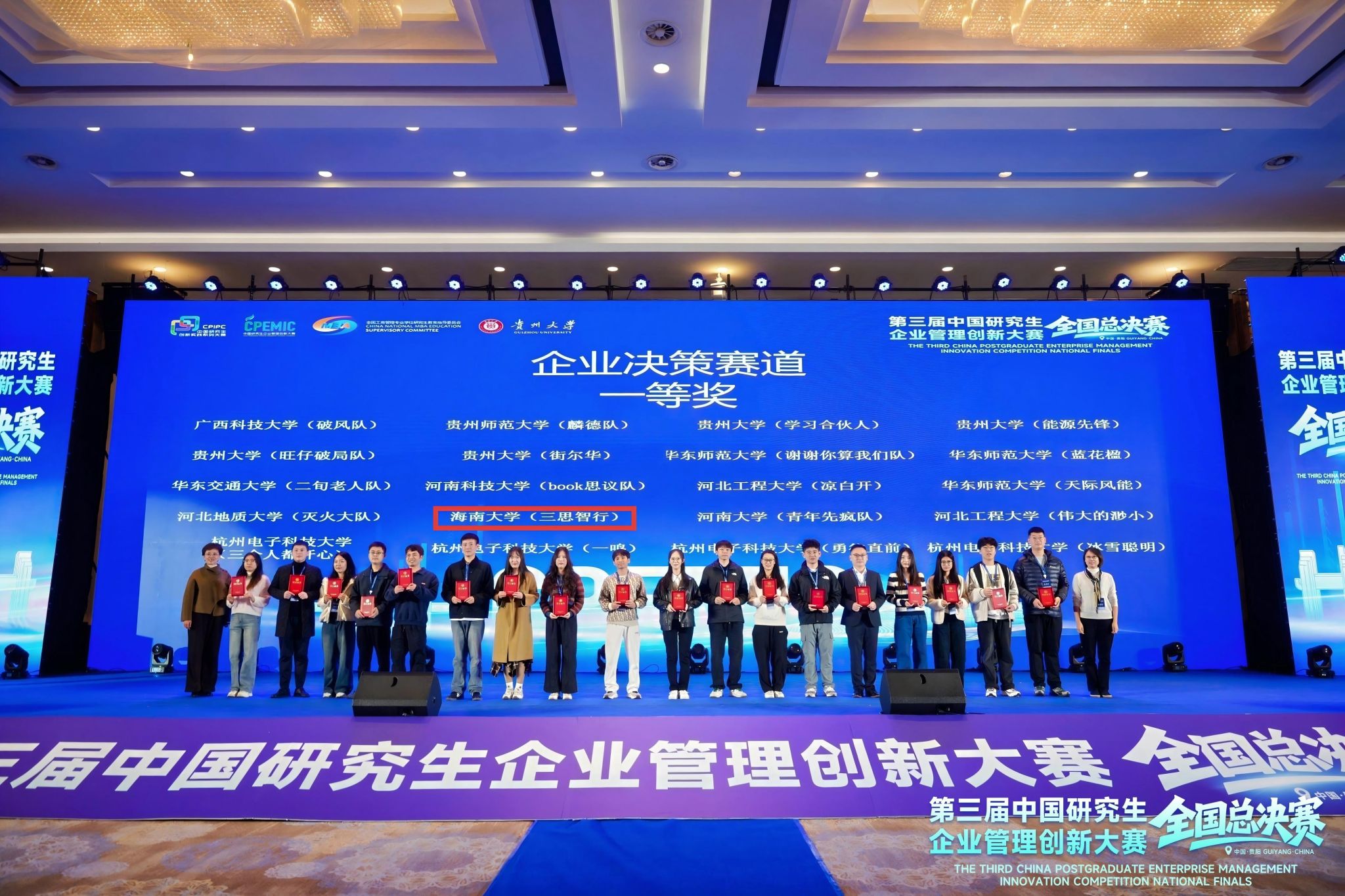 本站讯(通讯员 戚晓慧)2025年11月8日,第三届中国研究生企业管理创新大赛总决赛于贵州大学顺利结束。海南大学凭借出色的组织能力,荣获优秀组织奖,与北京大学、哈尔滨理工大学、电子科技大学等知名高校共同获此殊荣。海南大学MBA“三思智行队”,成功突围进入总决赛。