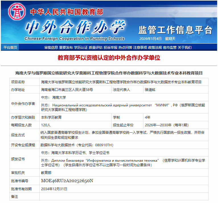 近日,据教育部网站公布信息,我校与俄罗斯国立核能研究大学莫斯科工程物理学院合作举办的数据科学与大数据技术专业本科教育项目正式获批。该项目是海南大学深入贯彻落实习近平总书记“要支持海南大学创建世界一流学科”重要指示精神,推动高水平教育对外开放的又一重要成果,旨在服务国家战略,为海南自由贸易港建设培养具备国际视野的新一代信息技术高端人才。