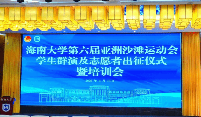 近日,第六届亚洲沙滩运动会将在海南三亚举行。3月15日上午,我校于社科楼二楼报告厅隆重举行海南大学第六届亚洲沙滩运动会志愿者及群演出征仪式暨培训会,为即将奔赴三亚,参与赛事服务保障的全体志愿者,群演同学和带队教师壮行。本次出征仪式由校团委书记陈青主持。校党委常务副书记张继友,校党委常委,宣传部长胡景卫,国际传播与艺术学院党委书记何映敏,外国语学院党委书记覃成海,学生工作部副部长张井富以及全体亚沙会学生群演,学生志愿者,带队老师等参加本次活动。