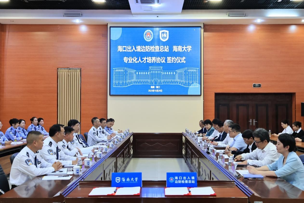 本站讯(记者 刘俊乐 范宇婷)10月29日下午,海南大学与海口出入境边防检查总站在海南大学思源学堂多功能厅举行专业化人才培养协议签约仪式,开启校站合作新篇章。海口出入境边防检查总站党委书记、总站长王海兴,海南大学党委书记李湖出席签约仪式,校党委常委、副...