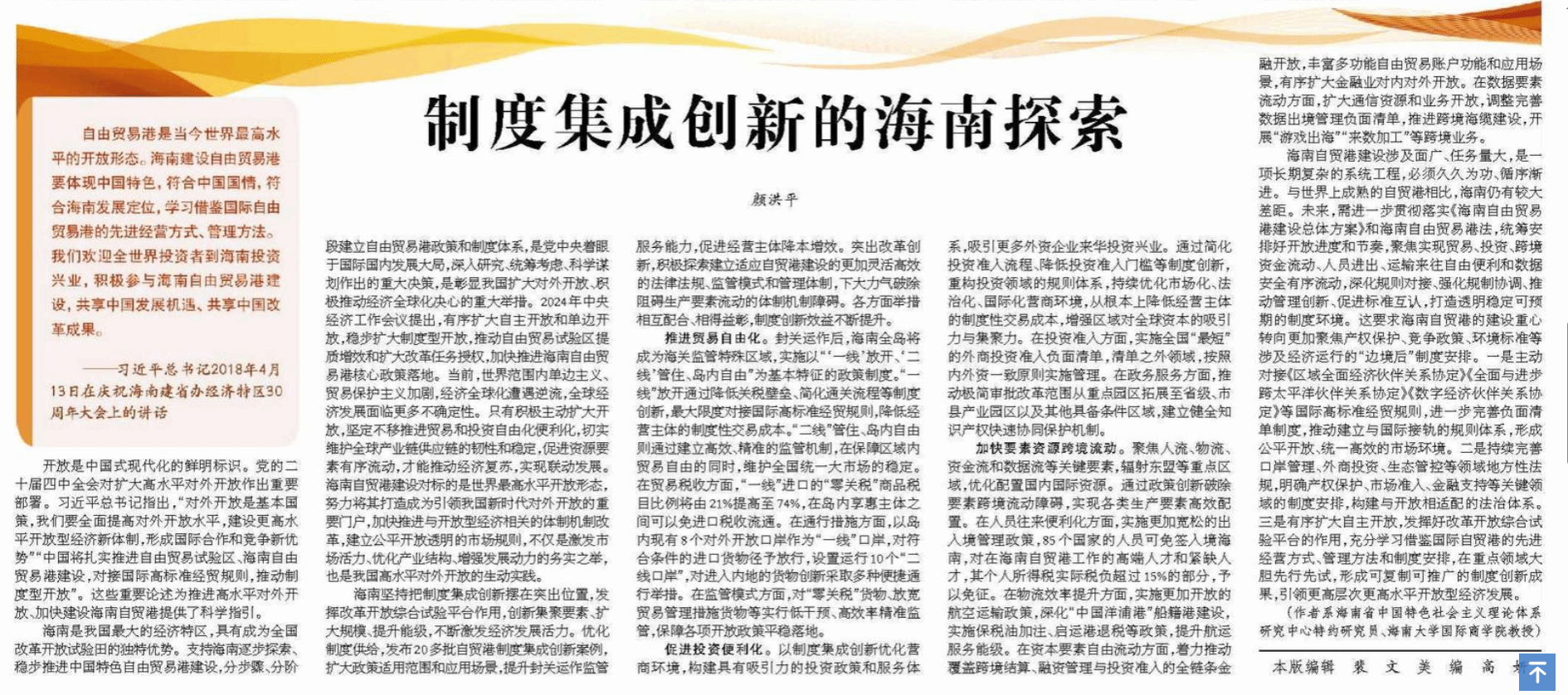 本站讯(通讯员 陈艺靖)2025年10月28日,海南大学国际商学院颜洪平教授的理论文章《制度集成创新的海南探索》在《经济日报》理论版重磅发表。该文立足海南自贸港建设实践,系统阐释制度型开放的“海南路径”,为我国高水平对外开放提供了重要理论参考。文章紧扣“制...