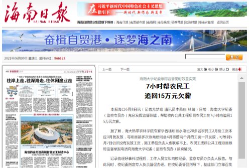 【办实事 开新局】海南大学纪委跟踪监督见时效显实效 7小时帮农民工追回15万元欠薪